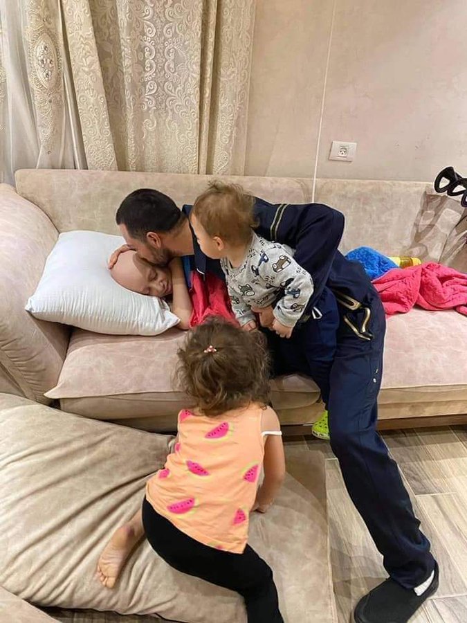 وتداول ناشطون على مواقع التواصل الاجتماعي، صورة لحجازي وهو يحتضن أحد أطفاله، بينما يودّع نجله أحمد، الذي يتلقى العلاج الكيماوي جراء إصابته بالسرطان، فيما تجلس ابنته الثالثة وتراقب والدها.