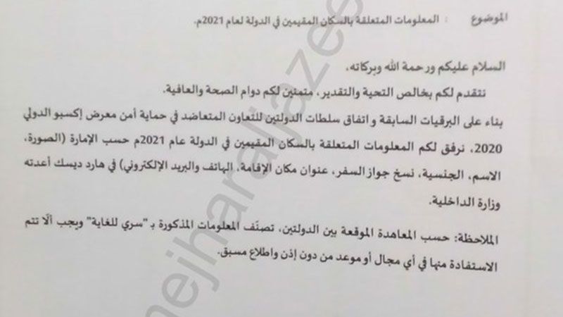 وبحسب الوثائق المسربة، فقد أرسلت وزارة الخارجية الإماراتية هذه المعلومات إلى كيان العدو من خلال رسالة رسمية موقّعة من قبل مدير إدارة شؤون الدبلوماسيين حمد مطر الشامسي لتتحكم سلطات الاحتلال بمعرض إكسبو 2020 الدولي بصورة مبرمجة وأدق لتوفير أمنه.