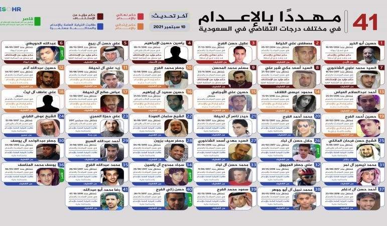 أعربت المنظمة الأوروبية السعودية لحقوق الإنسان في سلسلة تغريدات عبر حسابها على “تويتر” عن خشيتها على حياة نحو 41 معتقلًا في المملكة السعودية، جراء تعرّضهم لمحاكمات غير عادلة بعد سجنهم بشكل تعسّفي.