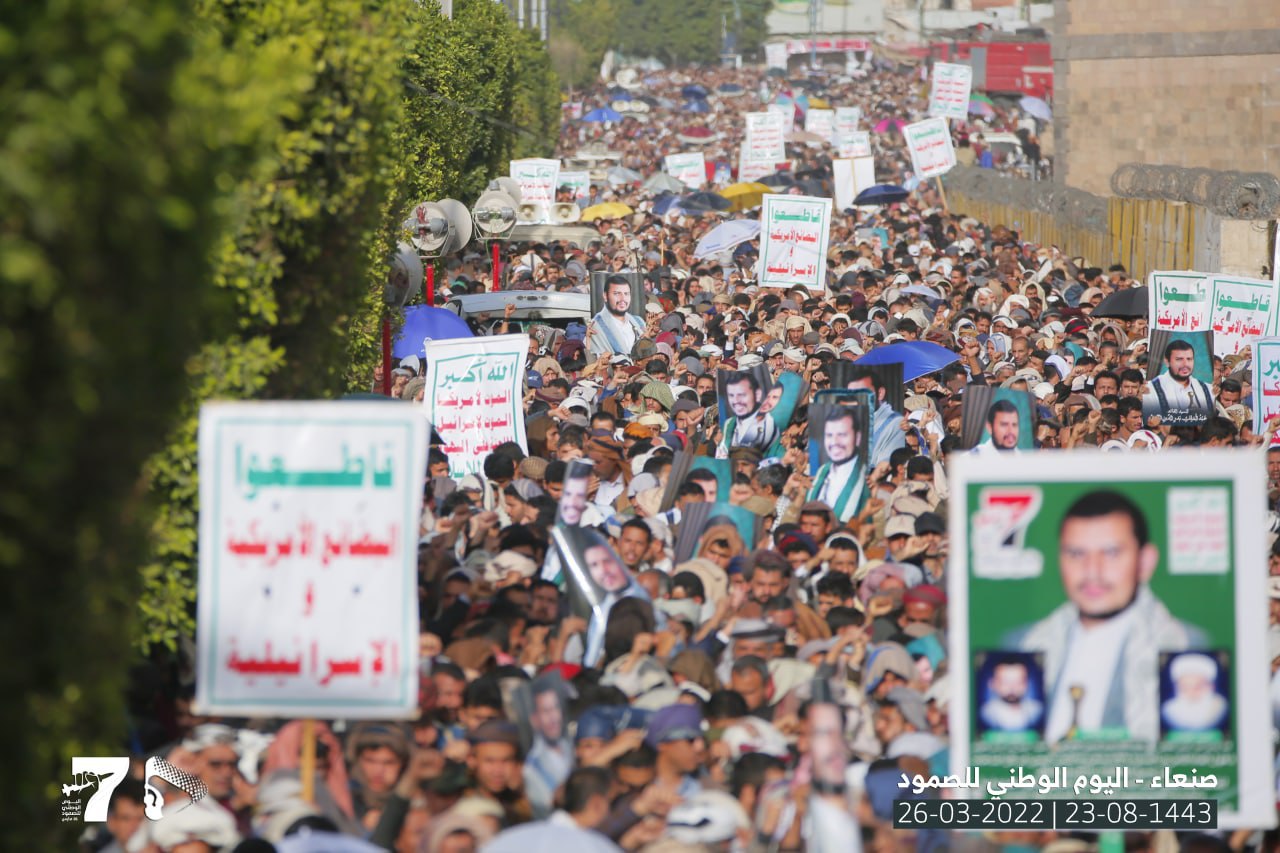 شهدت العاصمة صنعاء عصر اليوم، مسيرة جماهيرية حاشدة في ساحة “باب اليمن” إحياءً لليوم الوطني للصمود في مواجهة قوى العدوان وتدشيناً للعام الثامن تحت شعار “والعاقبة للمتقين”.