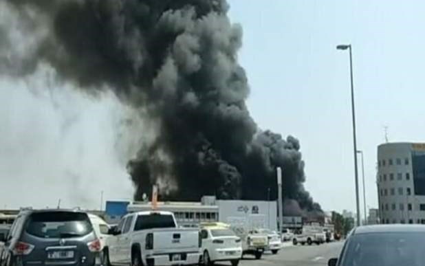 شب حريق ضخم في سفينة شحن محملة بالسيارات في ميناء دبي بالإمارات.