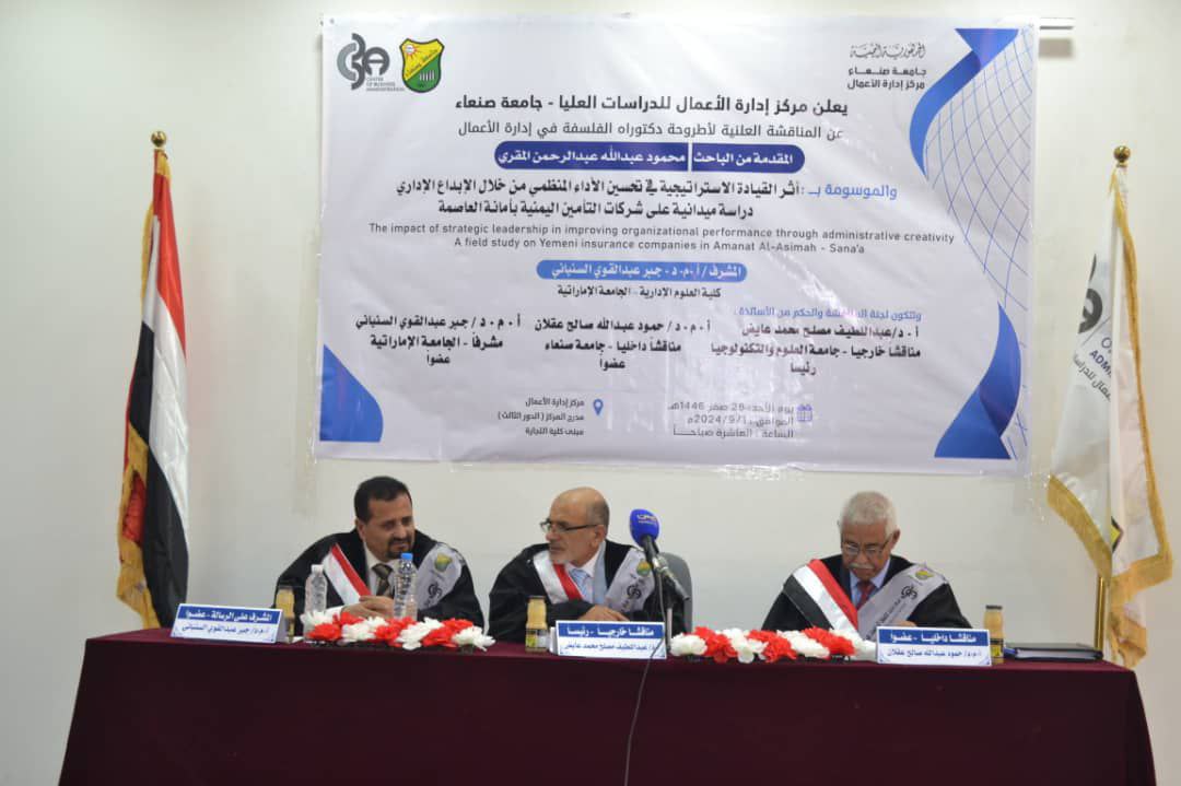 حصل الباحث محمود عبدالله عبدالرحمن المقري على درجة الدكتوراه من مركز إدارة الأعمال بجامعة صنعاء عن أطروحته الموسومة بـ ” أثر القيادة الاستراتيجية في تحسين الأداء المنظمي من خلال الإبداع الإداري” .. دراسة ميدانية على شركات التأمين اليمنية بأمانة العاصمة صنعاء.