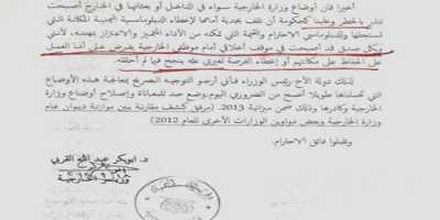 وختم رسالته بالقول ” ان اوضاع وزارة الخارجية سواء في الداخل او بعثاتها في الخارج أصبحت تنذر بالخطر وعلينا كحكومة أن نقف بجدية أمامها لاعطاء الدبلوماسية اليمنية المكانة التي تستحقها وللدبلوماسي الاحترام والقيمة التي تمكنه من الاداء المتميز والاعتزاز بمهنته ’ لأنني وبكل صدق قد أصبحت في موقف أخلاق أمام موظفي الخارجية يفرض علي?ِ اما العمل على الحفاظ على مكانتهم أو اعطاء الفرصة لغيري عله ينجح فيما لم أحققه “.