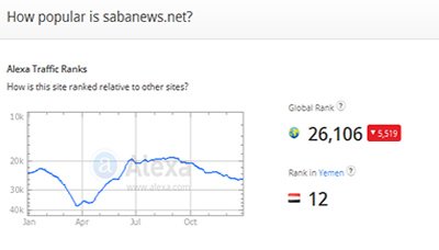 حقق موقع وكالة الأنباء اليمنية سبأ المركز الثاني على مستوى المواقع اليمنية ” الأكثر زيارة ” بحسب التصنيف العالمي لموقع Alexa للعام 2015م.