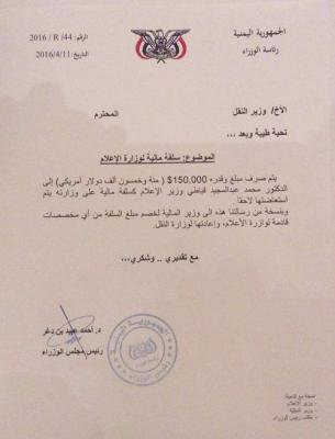 حيث وجه احمد بن دغر وزير النقل في حكومته بصرف 150 ألف دولار لوزير اعلام هادي محمد عبده قباطي، ليتصرف بها كيف يشاء، وتسجل سلفة على وزارة الاعلام .