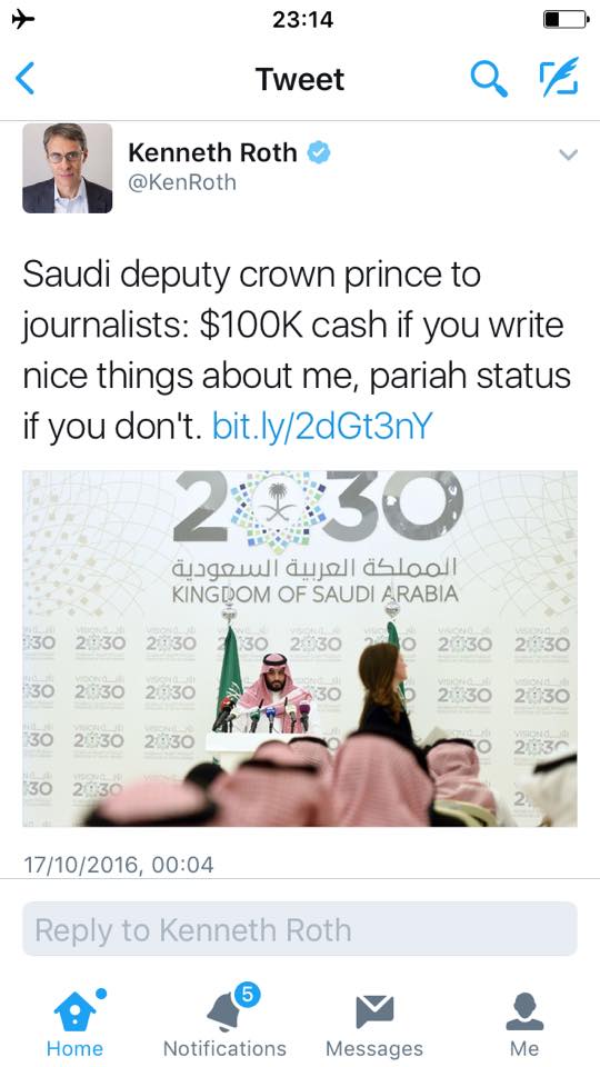 واشار روواث رئيس المنظمة في منشور له على صفحته بالتويتر الى ان محمد بن سلمان ولي ولي العهد السعودي عرض على الصحفيين مائة الف دولار مقابل الكتابة عنه بصور لائقه.منوهاً بشكل ساخر الى ان هذه المهمة السرية لأبن سلمان تأتي ضمن رؤيته الاقتصادية للمملكة حتى 2030