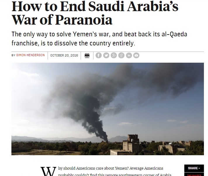 وأشارت المجلة، إلى التعاون الأمريكي مع السعودية في الحرب على اليمن وصرحت بأن الرياض طالبت بدعم الولايات المتحدة للقتال ضمن ما تسمى قوات التحالف التي تقودها السعودية لإعادة حكومة عبد ربه هادي منصور إلى صنعاء.