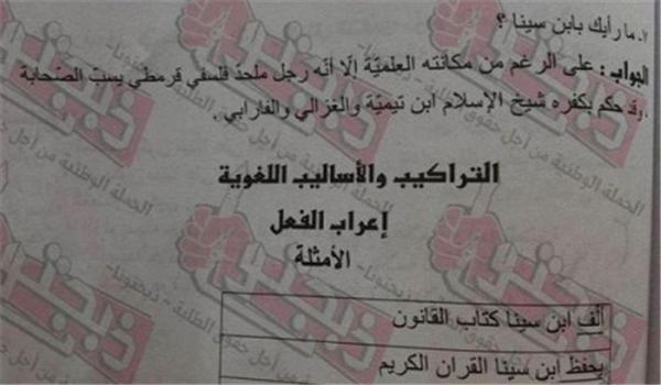 وأبدت الحملة استغرابها من هذا الجواب “النموذجي” وفق المعلم معد الدوسية، علماً بأن محتوى المادة الموجودة في الكتاب لا يمت بصلة للإجابة التي وضعها هذا المعلم، بل على العكس، فنص المادة يشيد بابن سينا من كافة النواحي، معبرة عن استيائها من تكفير عالم كبير بحجم ابن سينا، لمجرد أن “المعلم” سمع أحدهم في درس ديني أو على شاشة فضائية مشبوهة يتهمه بالكفر..