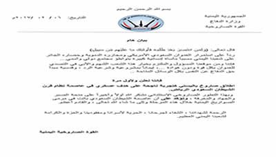 اصدرت القوة الصاروخية للجيش واللجان الشعبية بياناً هاماً بشأن تجربتها الصاروخية البالستية الناجحة التي اجرتها مساء اليوم واستهدفت قاعدة عسكرية بمنطقة المزاحمية غربي العاصمة السعودية الرياض