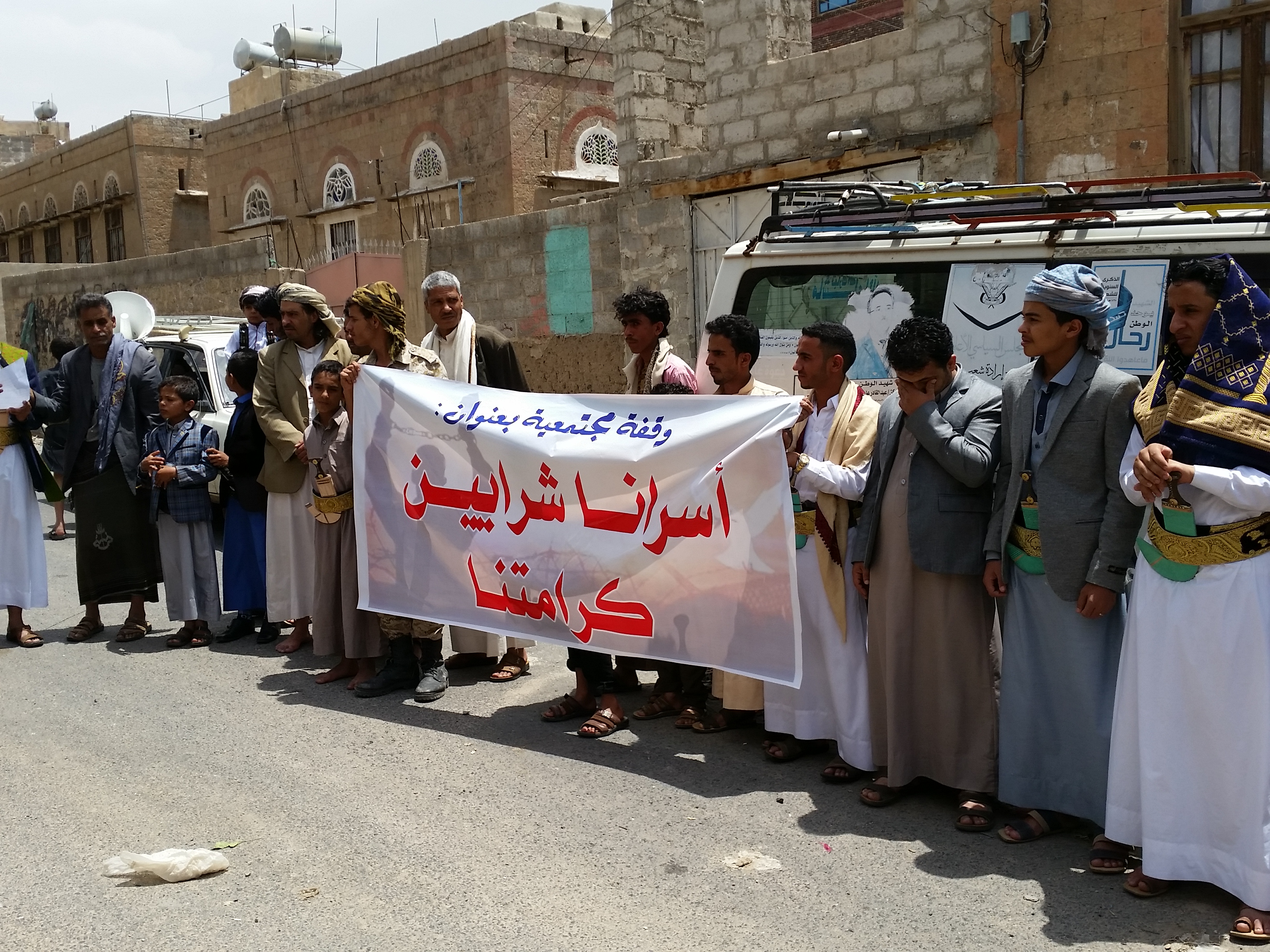 وشارك العشرات من ابناء منطقة الروض بصنعاء في الوقفة التي اقيمت تحت شعار ” اسرانا شرايين كرامتنا ”