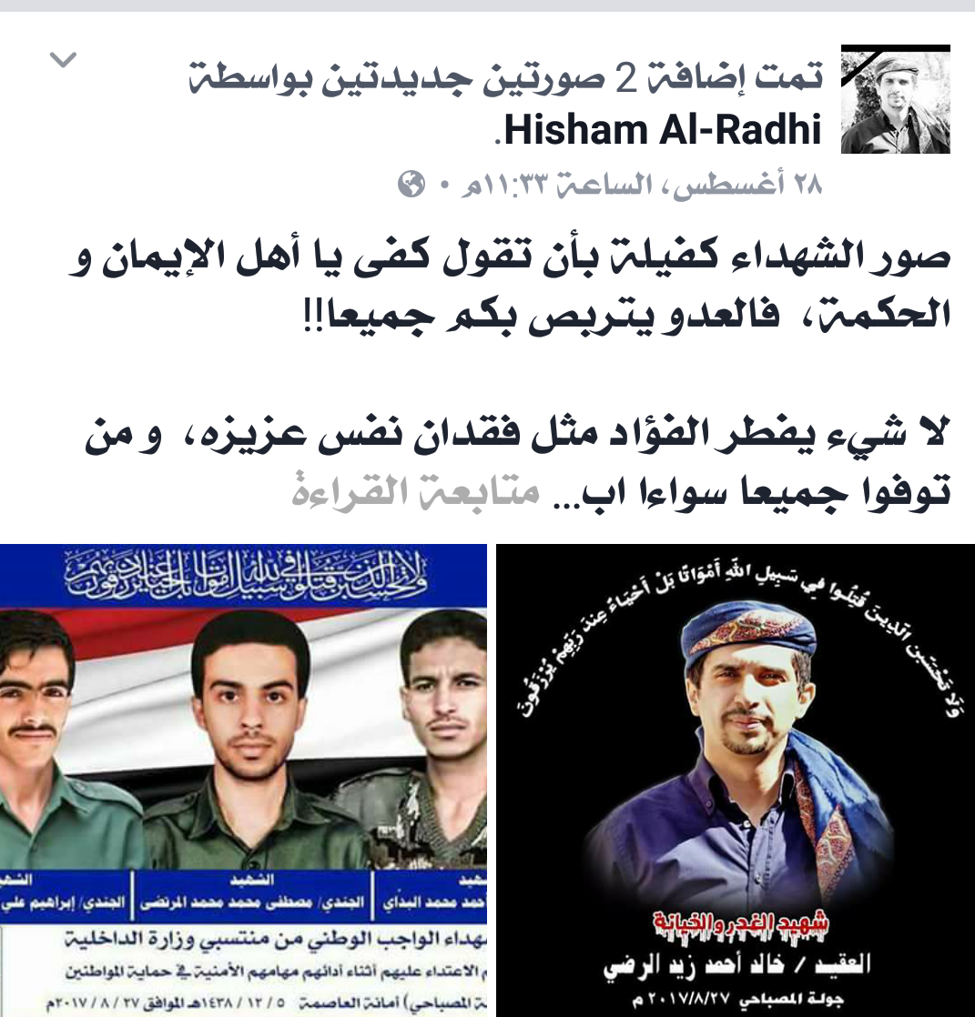 في اول تعليق لهم على الاحداث التي جرت في جولة المصباحي بالعاصمة صنعاء وادت الى استشهاد ثلاثة من اللجان الامنية والعقيد خالد الرضي.. نشر السفير هشام يحيى زيد الرضي على صفحته بالفيسبوك منشورا معززا بصور الشهداء , نعى فيه ابن عمه وشهداء الواجب, مؤكدا ان صور الشهداء كفيلة بأن تقول كفى يا أهل الإيمان و الحكمة، فالعدو يتربص بكم جميعا!!