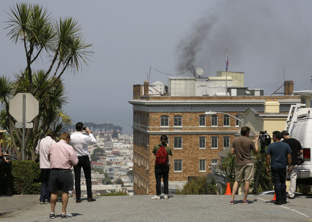 وتصاعد صباح السبت دخان أسود من القنصلية الروسية في سان فرانسيسكو عشية إغلاقها. وهرع عناصر فرق الإطفاء في المدينة إلى المكان، إثر انطلاق أجهزة إنذار الحريق في المبنى، لكنها أكدت لاحقاً أن لا حريق في المبنى، وأن كل شيء كما يرام. على رغم ذلك، رجّحت ناطقة باسم فرق الإطفاء أن يكون موظفو القنصلية يحرقون أغراضاً في الموقد.