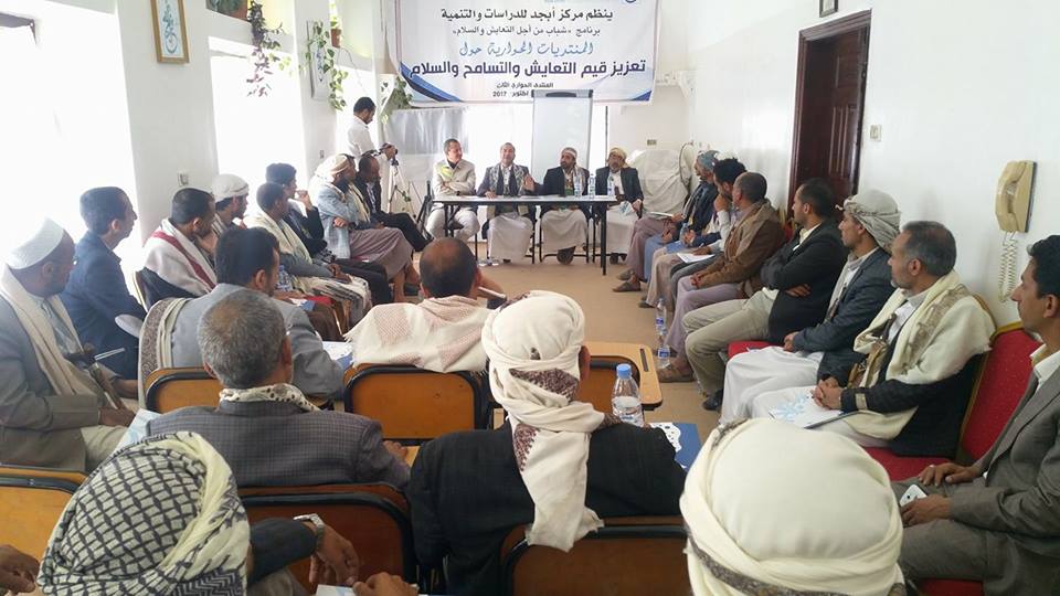 نظم مركز أبجد للدراسات والتنمية بذمار، صباح الخميس, المنتدى الحواري الثالث استهدفت خمسين مشارك من خطباء المساجد والمرشدين بمحافظة ذمار ضمن برنامج (شباب من اجل التعايش والسلام) حول تعزيز قيم التعايش والتسامح والسلام.
