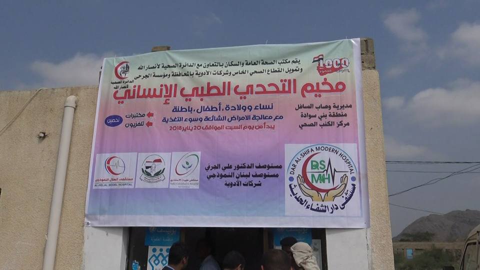 افتتح مكتب الصحة العامة والسكان بمحافظة ذمار وبتعاون الدائرة الصحية لأنصار الله وبتمويل من المستشفيات الخاصة ومؤسسة الجرحى فرع ذمار مخيم التحدي الطبي الإنساني الأول في منطقة المشرافة بمديرية وصاب السافل.