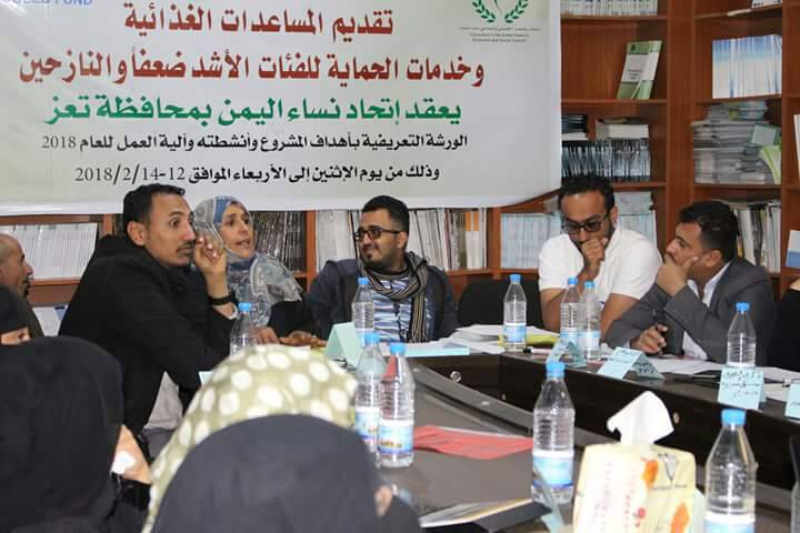 اتحاد نساء اليمن بتعز ينفذ ورشة تعريفية بمشروع المساعدات الغذائية وخدمات الحماية للنازحين