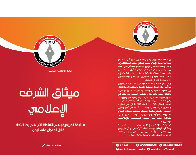 أصدر اتحاد الإعلاميين اليمنيين كتيب ميثاق الشرف الإعلامي والذي يعتبر ضمن المهام والأنشطة الرئيسية لاتحاد الإعلاميين اليمنيين للعام الجاري 2018م .