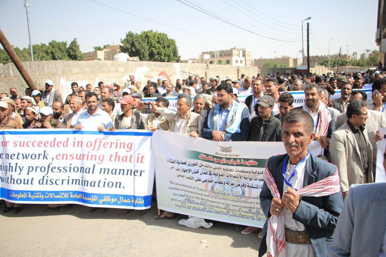 نفذ موظفو قطاع الإتصالات وقفة احتجاجية كبيرة أمام مقر الأمم المتحدة بالعاصمة صنعاء.
