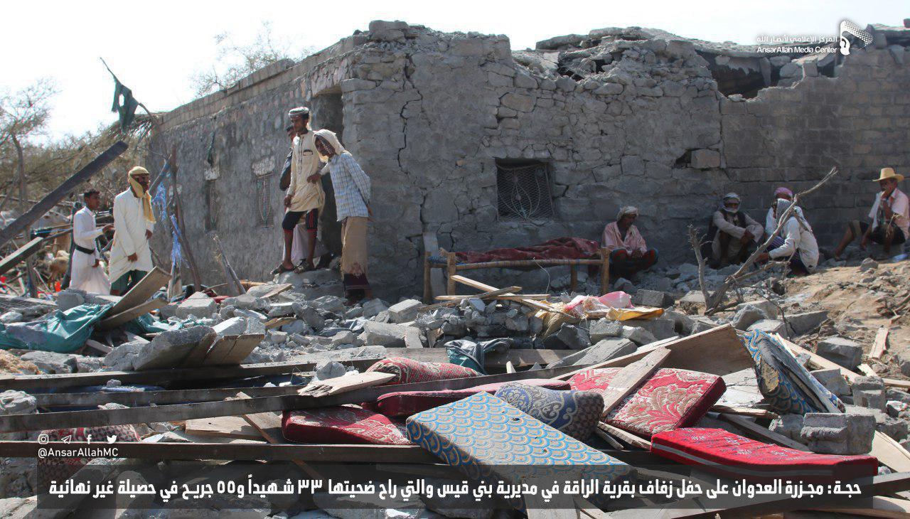 هذا وكانت عدد من المنظمات الحقوقية والإنسانية المحلية والدولية العاملة في اليمن وكذا الأحزاب السياسية أدانت الجريمة المروعة التي ارتكبها طيران تحالف العدوان على اليمن باستهدافه حفل زفاف بقرية الراقة في بني قيس محافظة حجة مساء الأمس والتي راح ضحيتها أكثر من نحو 90 شهيدا وجريحا. معتبرة في بيانات صدرت عنها الاثنين الجريمة عملاً إرهابياً متعمداً.