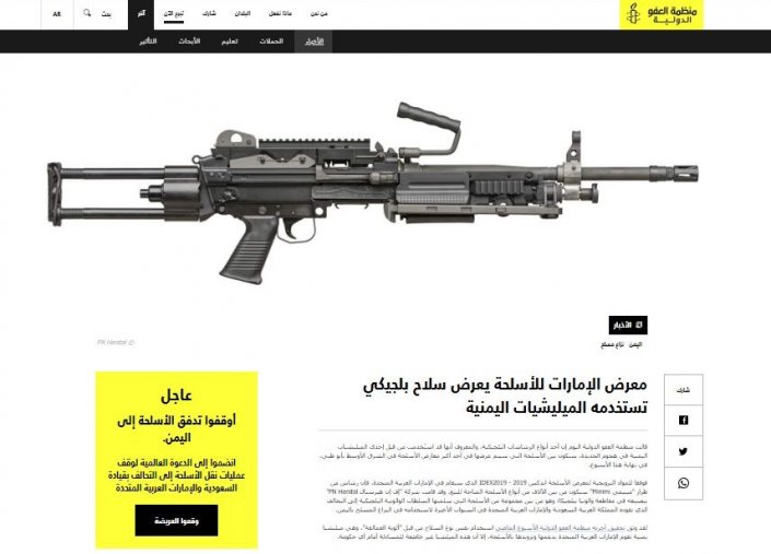 واشارت المنظمة في بيان لها، الى أنه وفقا للمواد الترويجية لمعرض الأسلحة ايدكس 2019 – IDEX2019 الذي سيقام في الإمارات، فإن رشاش من طراز “مينيمي Minimi” سيكون من بين الآلاف من أنواع الأسلحة المتاحة للبيع.