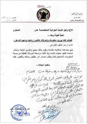 وجاء في الوثيقة الصادرة عن قائد وحدة مكافحة الإرهاب في عدن يسران القباطي بأن أمن عدن رصد تواجد المطلوب الأمني رمزي الكمراني الموالي لهادي، في معسكر للحماية الرئاسية.