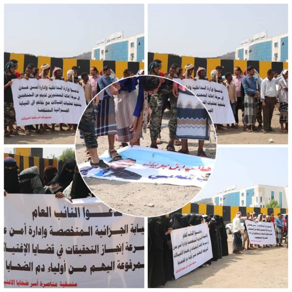 وأكد أولياء دم المجني عليه “سمحان عبدالعزيز الراوي” في وقفة احتجاجية اقاموها امس الخميس أمام المجمع القضائي بمديرية خور مكسر بمحافظة عدن على ضرورة تسريع عقد جلسات محاكمة المتهمين باغتيال ابنهم.
