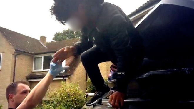 وعثر سيمون فنتون وزوجته سالي، من مدينة نيوبيري في بيركشاير، على الصبي البالغ من العمر 17 عاما، الذي كان يختبيء في صندوق سقف السيارة يوم السبت، عقب عودتهما إلى بريطانيا من رحلة لمنطقة كاليه بفرنسا.