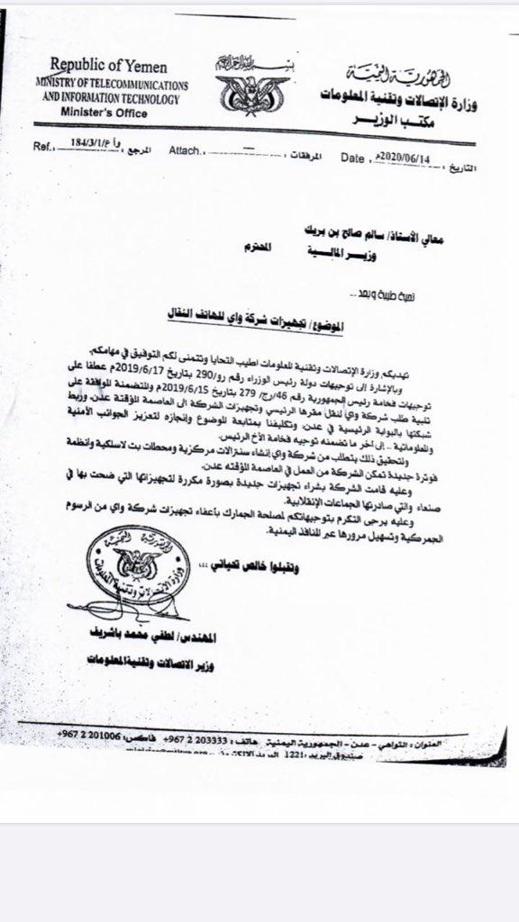 من جانبه نشر الناشط مصطفى احمد نعمان على صفحته بالتويتر وثيقة رسمية تضمنت رسالة من وزير الاتصالات في حكومة المرتزقة الى وزير ماليته من اجل اعفاء شركة واي من جميع الرسوم الضريبية والجمركية المتعلق بالأجهزة والمعدات التي تعتزم توريدها من الخارج لتشغيل مركزها من عدن, واعتبر نعمان ذلك مخالفاً للقانون وخاصة المادة 13 من قانون الضرائب التي تمنع الغاء دفع الضريبة العامة او اعفاء اي جهة من دفعها الا بموجب قانون.
