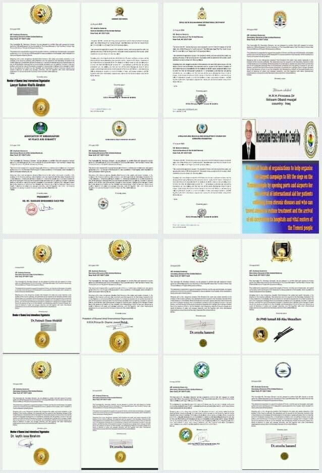 نظم المستشار .د طارق سلطان الزريقي الامين العام للمنظمة الانسانية للسلام والإغاثة والتنمية HOPRD حملة دولية لمنظمات المجتمع المدني الدولية لدعم اليمن تطالب الأمم المتحدة والامين العام للأمم المتحدة والمنظمات الدولية بسرعة رفع الحصار الظالم عن الشعب اليمني.. حيث تضمنت رسائل من منظمات المجتمع المدني الدولية موجهة إلى الامين العام للامم المتحدة جاء فيها:-