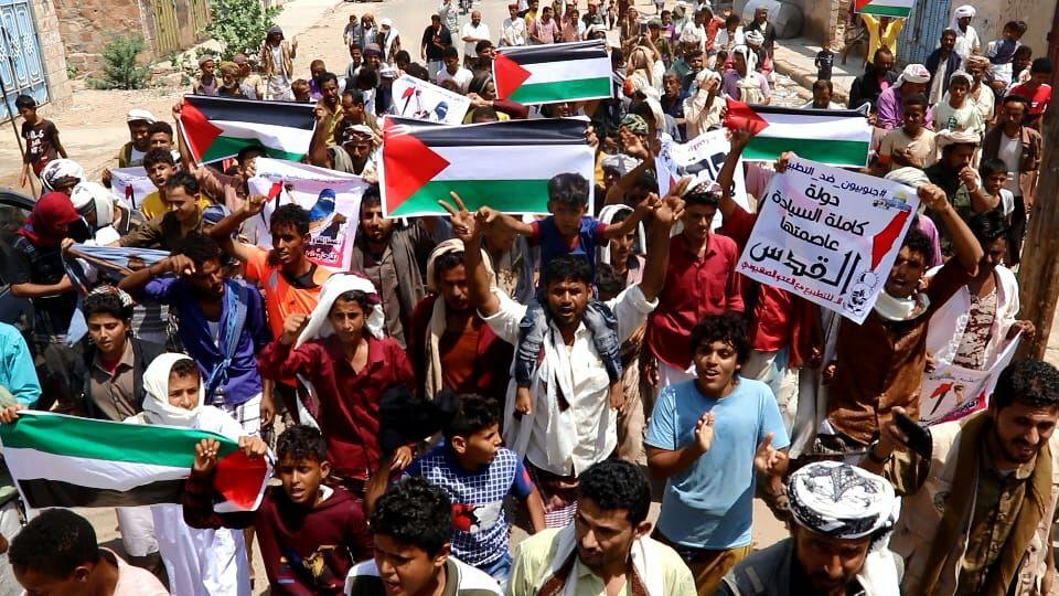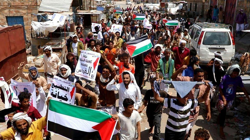 ورفع المشاركين في المظاهرتين التي خرجت عقب صلاة الجمعة، شعارات مؤيدة للقضية الفلسطينية ولافتات عبرت عن السخط الشعبي المتصاعد ضد الامارات المحتلة للمحافظات الجنوبية ، كما جرى إحراق اعلام العدو الإسرائيلي.