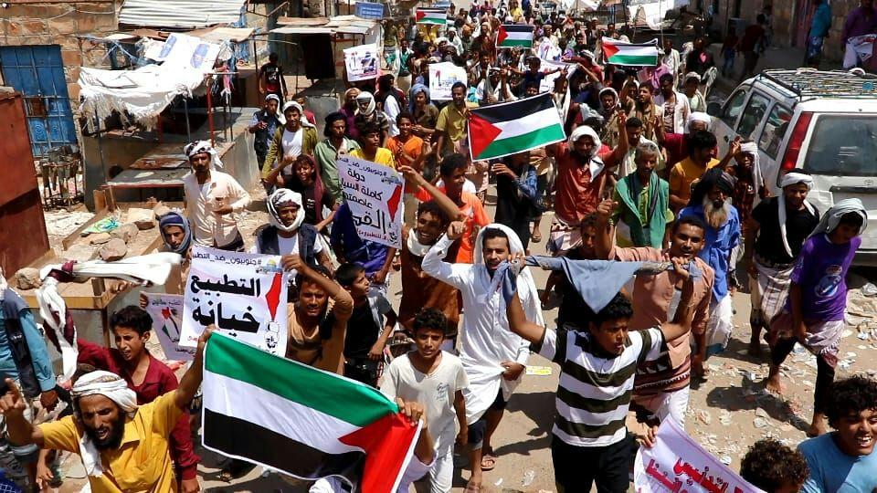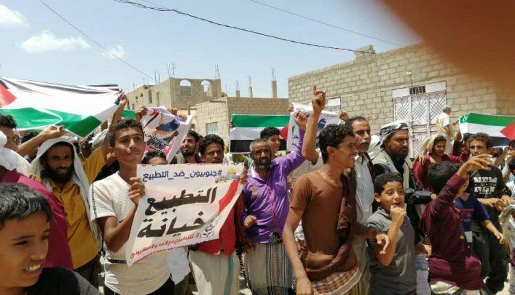 تواصلاً للرفض الشعبي للتطبيع الاماراتي البحريني مع دولة الكيان الإسرائيلي ، شهدت مديريتي موديه والوضيع بمحافظة أبين الواقعتان تحت الإحتلال الامريكي السعودي الاماراتي، اليوم الجمعة، مظاهرات حاشدة مناهضة للتطبيع الخليجي.