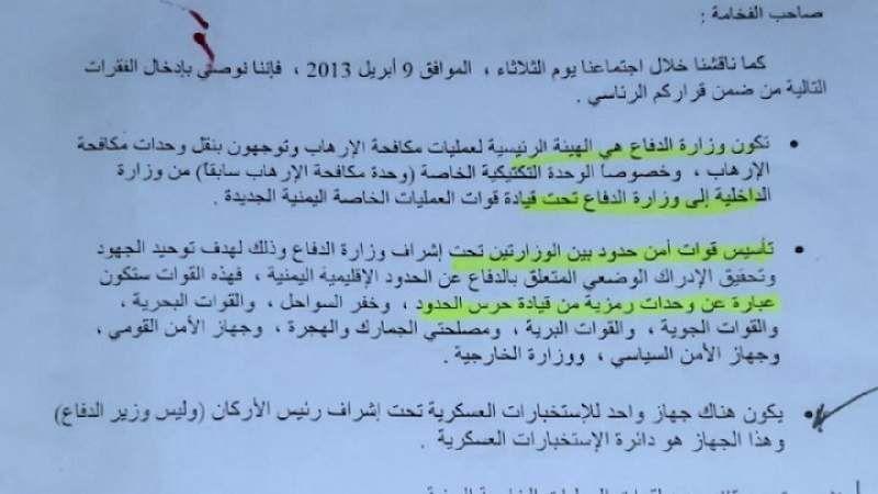 وتضمنت الوثائق الصادرة عن السفارة الأمريكية قبل الثورة توجيهات من السفير الأمريكي الأسبق جيرالد فايرستيان للرئاسة بنقل ما يسمى “وحدات مكافحة الإرهاب” من وزارة الداخلية إلى الدفاع، كما تضمنت الوثائق توجيهات أمريكية بالاقتصار على وحدات رمزية لتكون قوات أمن للحدود اليمنية البرية والبحرية.