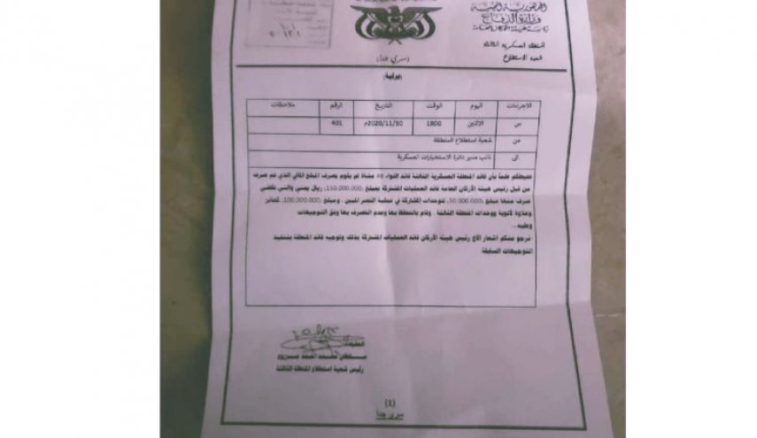 كشفت وثيقة رسمية صادرة عن الاستخبارات العسكرية التابعة لحكومة هادي عن قيام قائد مايسمى بالمنطقة العسكرية الثالثة منصور ثوابة بالسطو على 150 مليون ريال من مخصصات المجندين التابعين للمنطقة.