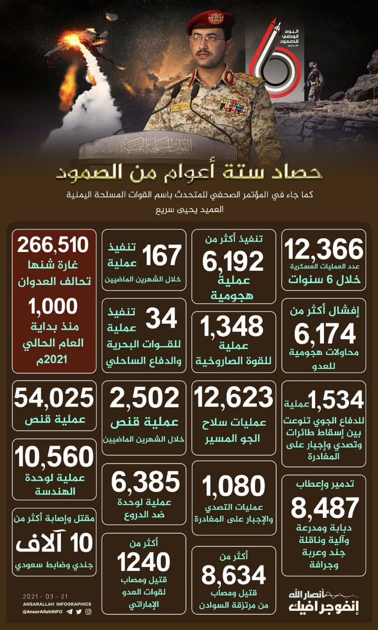 استعرض المتحدث الرسمي للقوات المسلحة العميد يحيى سريع في مؤتمر صحفي له ، الأحد، وبشكل مختصر احصائيات وأرقام تتعلق بالمواجهة العسكرية خلال ست سنوات من الصمود.