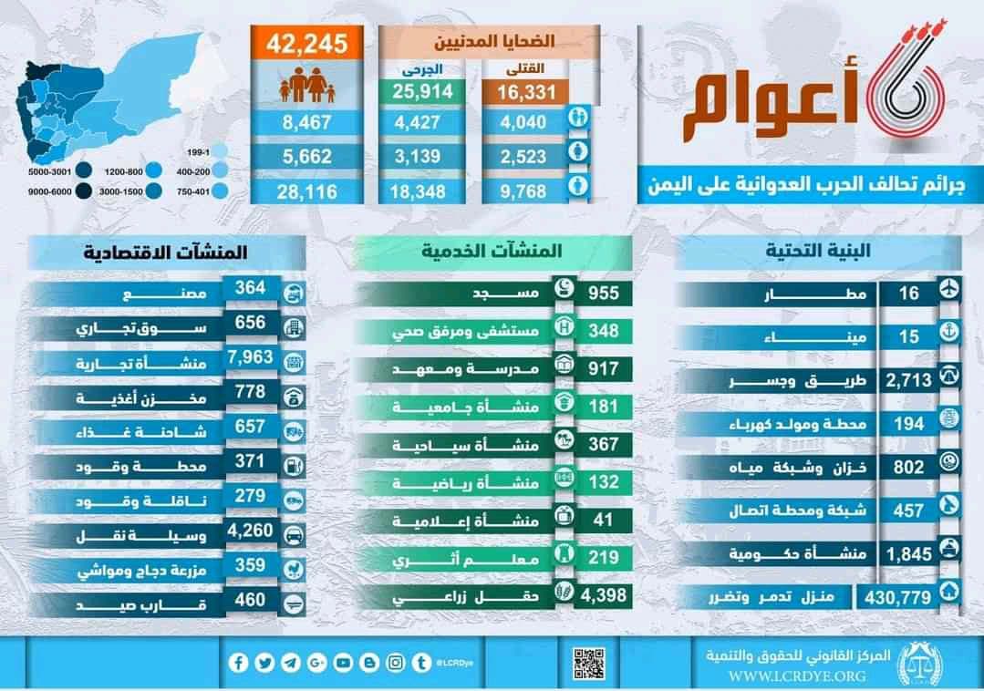 المركز القانوني يصدر إحصائية جديدة لاعوام العدوان على اليمن (انفوجرافيك)