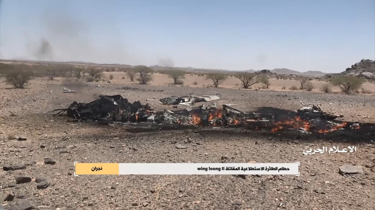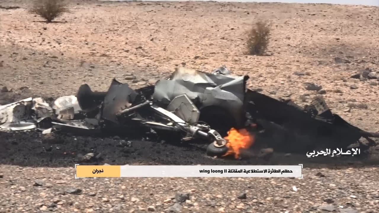 وتظهر المشاهد الطائرة الأمريكية المقاتلة من نوع (WING LOONG II) وهي تحترق، وبقايا أجزائها التي تناثرت في المكان.