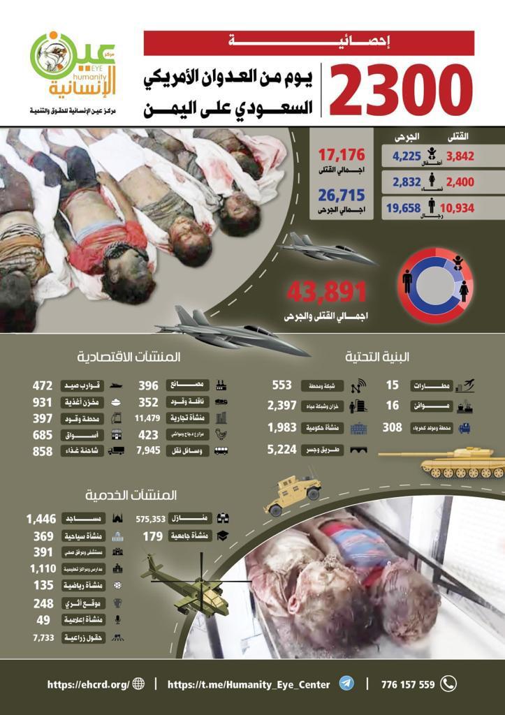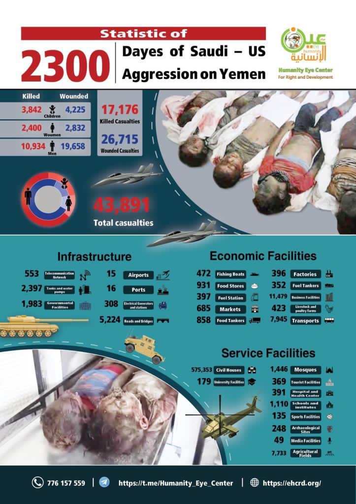 أصدر مركز عين الإنسانية للحقوق والتنمية ، اليوم الأحد، تقريرا يوثق ما ارتكبه العدوان الأمريكي السعودي الإماراتي بحق اليمنيين خلال 2300 يوم من العدوان.