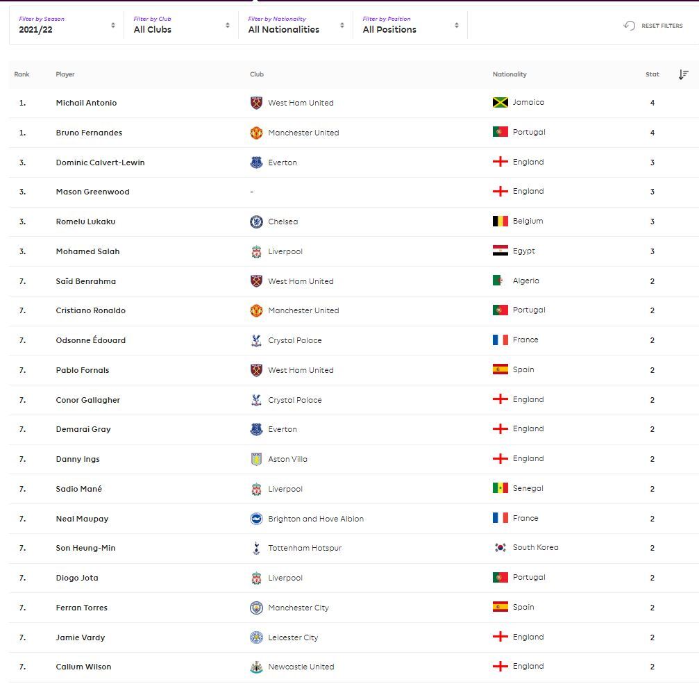 وأحرز النجم البرتغالي الآخر برونو فيرناديز الهدف الثالث لمنانشستر يونايتد، وتصدر ترتيب الهداف برصيد أربعة أهداف، مع الإنجليزي ميشيل أنطونيو مهاجم فريق وست هام يونايتد.