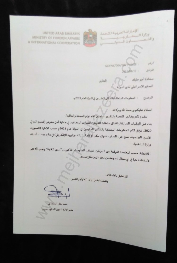 وبحسب الوثائق المسربة، فقد أرسلت وزارة الخارجية الإماراتية هذه المعلومات إلى كيان العدو من خلال رسالة رسمية موقّعة من قبل مدير إدارة شؤون الدبلوماسيين حمد مطر الشامسي لتتحكم سلطات الاحتلال بمعرض إكسبو 2020 الدولي بصورة مبرمجة وأدق لتوفير أمنه.