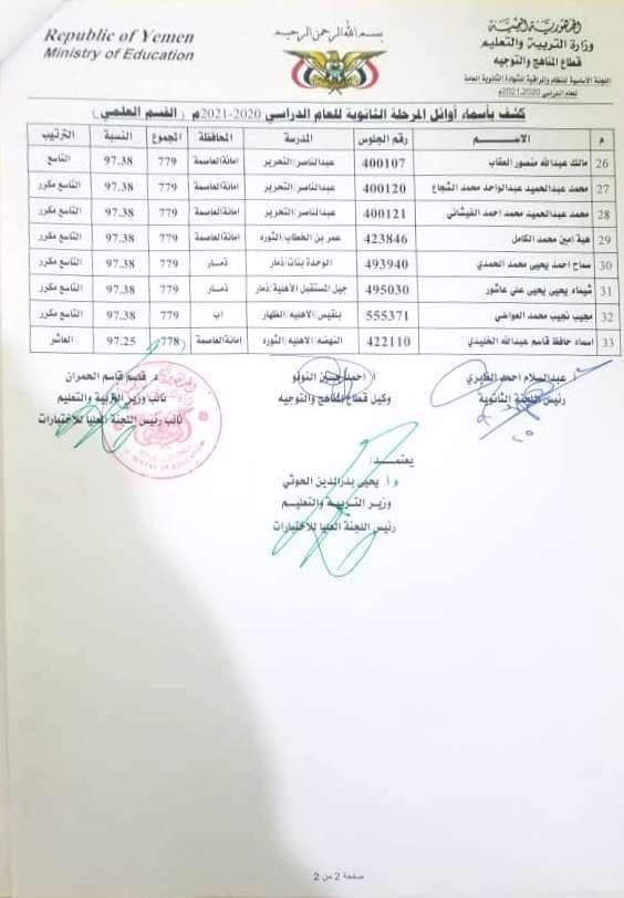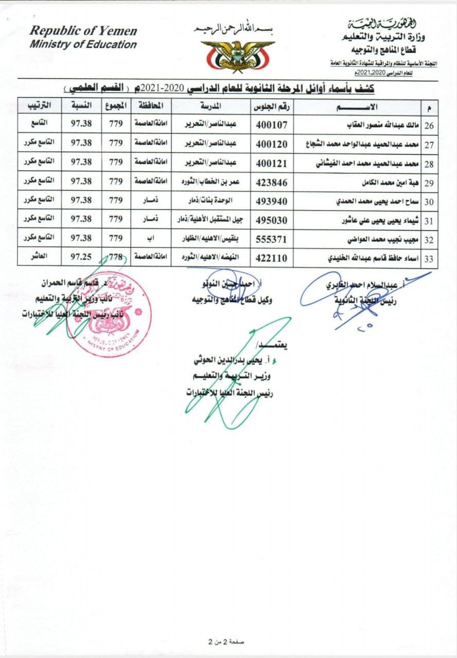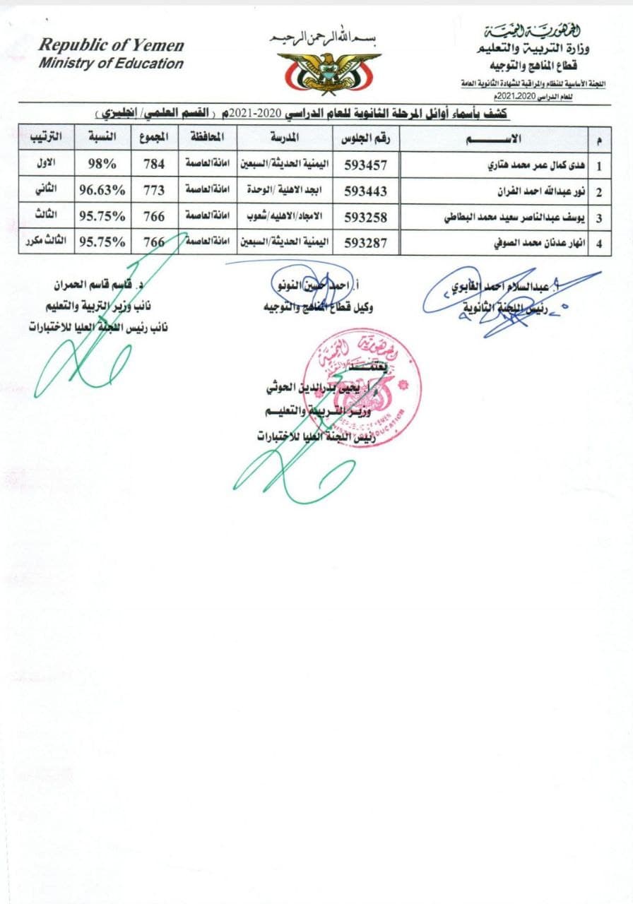 أعلنت وزارة التربية والتعليم نتيجة اختبارات الثانوية العامة للعام الدراسي ٢٠٢٠/ ٢٠٢١م بنسبة نجاح 79.19 بالمئة.