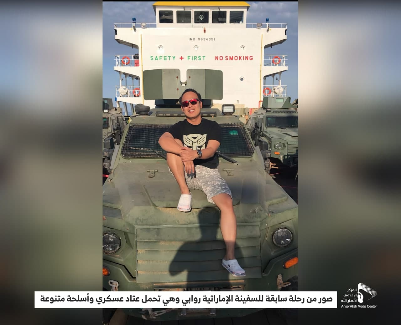 وأظهرت الصور نقل تحالف العدوان لآليات ومدرعات عسكرية متنوعة عبر السفينة “روابي” بتاريخ 4 نوفمبر 2021م.