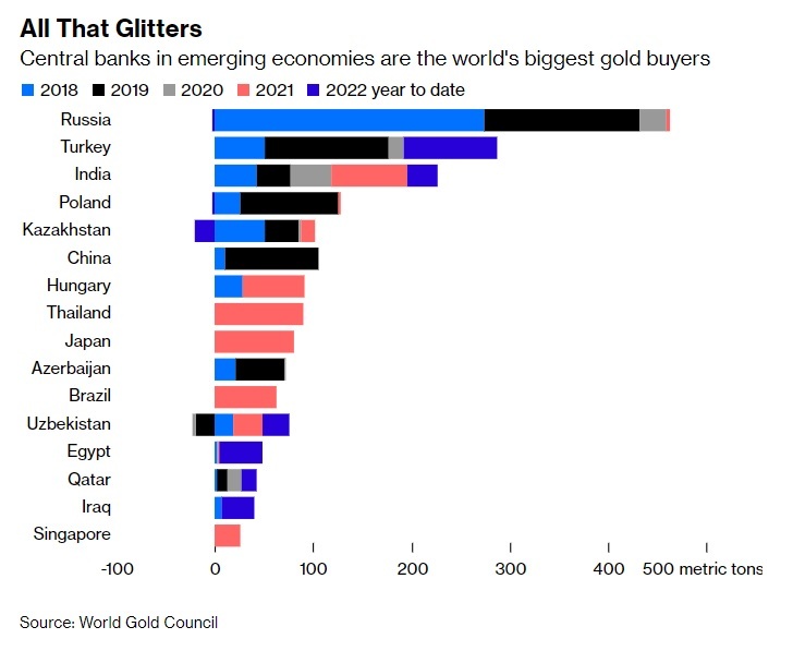 وكشف تقرير لوكالة “بلومبرغ” عن إقبال البنوك المركزية في العالم في السنوات الخمس الماضية (2018 – 2022) على شراء الأصفر الرنان.