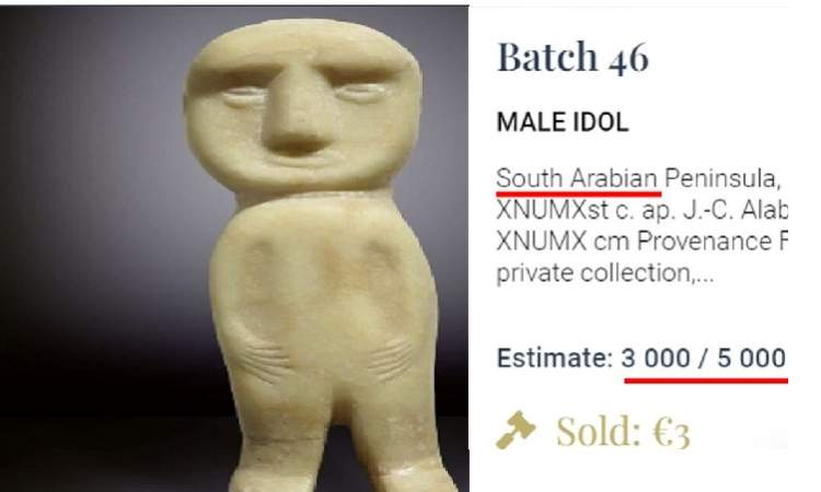 ونشر الناشط والخبير في مجال الآثار عبدالله محسن، أمس السبت، صوراً لقطعة أثرية يمنية بيعت بثمنٍ بخس في مزاد علني بأحد المزادات الأُورُوبية.