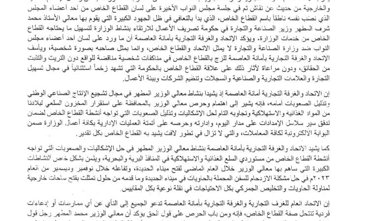وأشاد بيان الاتحاد والغرفة بنشاط وزير الصناعة في مجال تشجيع الإنتاج الصناعي الوطني وتذليل الصعوبات أمامه، واهتمامه وحرصه على المحافظة على استقرار المخزون السلعي لبلادنا من المواد الغذائية والاستهلاكية وتجاوبه التام لحل الإشكاليات وتذليل الصعوبات التي تواجه أنشطة القطاع الخاص لضمان تدفق سير سلاسل الإمدادات على مدار اليوم، وكذا حرصه على أتمتة العمليات الإدارية بكافة أعمال الوزارة ضمن البوابة الالكترونية لكافة المعاملات، والتي لا تزال في تطور لافت يشيد به القطاع الخاص بكل تقدير.