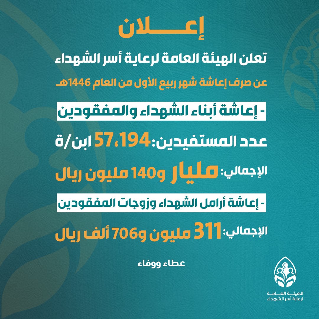 أعلنت الهيئة العامة لرعاية أسر الشهداء عن صرف إعاشة شهر ربيع الأول من العام 1446ﮪ لكلٍ من أبناء الشهداء والمفقودين، والبالغ عددهم 57.194 ابن وابنة، وبإجمالي مليار و140 مليون ريال، وكذلك إعاشة أرامل الشهداء وزوجات المفقودين، وبإجمالي مبلغ 311 مليون ريال.