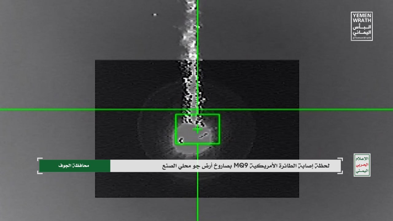 وفي تدوينة لها عبر منصة (إكس)، بث الاعلام الحربي، مقطع فيديو مصحوبا بعنوان “مشاهد إسقاط طائرة (MQ-9) الأمريكية أثناء قيامها بتنفيذ مهام عدائية في أجواء اليتمة بمحافظة الجوف، شمالي اليمن.