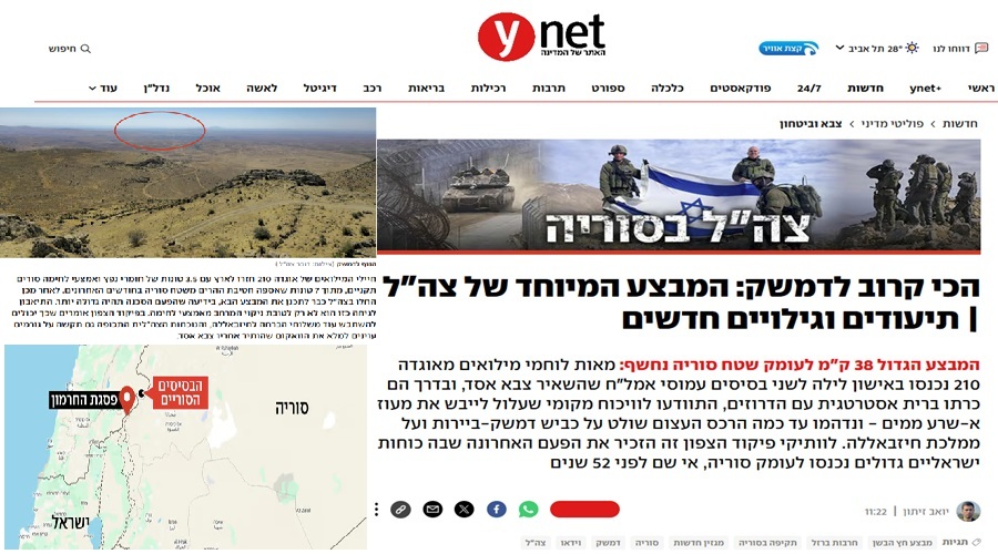 نشرت صحيفة “يديعوت أحرونوت الصهيونية” تفاصيلَ ما اعتبرته “أكبرَ عملية توغُّلٍ في الأراضي السورية على عُمق 38 كيلومترًا في أعقابِ سقوط نظام بشار الأسد في ديسمبر الماضي”، مؤكّـدة أن جيشَ الاحتلال تفاجأ من أن “مواقعَ عسكريةً سوريةً تكشفُ مواقعَ صهيونية مهمة”؛ نظرًا لارتفاعها.