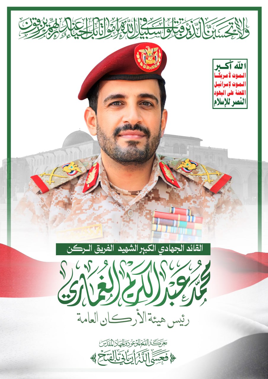 وإننا اليوم في القوات المسلحة اليمنية نزف إلى شعبنا اليمني المسلم المجاهد العزيز ضمن قافلة الشهداء العظماء الذين ارتقوا في مختلف الغارات التي شنها العدوان الإجرامي الأمريكي الصهيوني على بلدنا خلال عامين من معركة طوفان الأقصى وحازوا الشرف العظيم في بذل دمائهم في هذه المعركة المشرفة ضد العدو الإسرائيلي القائد الجهادي اللواء الركن محمد عبد الكريم الغماري مع بعض مرافقيه وولده الشهيد حسين البالغ من العمر(13 عاما ) وقد ارتقت روحه الطاهرة وهو في سياق عمله الجهادي وأداء واجبه الإيماني شهيدا سعيدا ضمن قافلة العظماء الشهداء على طريق القدس.