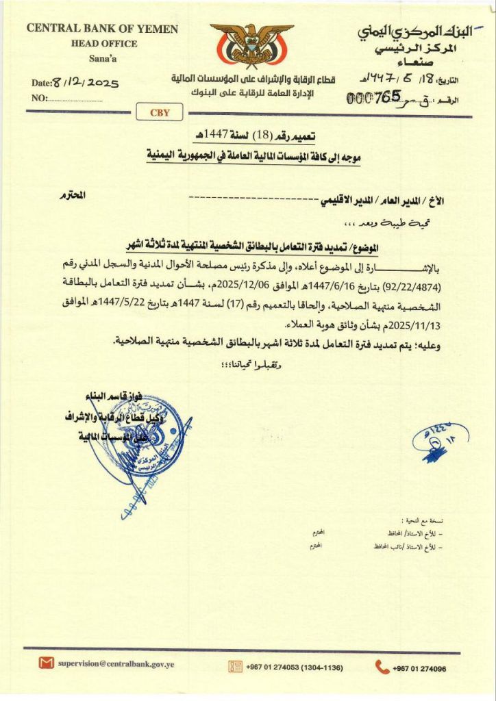 وبحسب التعميم، الذي نشرته جمعية الصرافين اليمنيين عبر حسابها على منصة “تلغرام”، وجّه البنك المركزي المؤسسات المالية بضرورة تمديد فترة قبول البطاقة الشخصية المنتهية الصلاحية لمدة ثلاثة أشهر إضافية، وذلك استنادًا إلى مذكرة رئيس مصلحة الأحوال المدنية والسجل المدني، وإلحاقًا بالتعميم رقم (17) لسنة 2025م المتعلق بوثائق هوية العملاء.