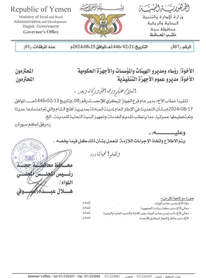 اعتبر مشائخ واعيان ووجهاء ومجتمع مدني مديرية أفلح الشام بمحافظة حجة قرار اعتماد منطقة العبادلة منطقة حضرية واختيارها كمدينة لمديرية افلح الشام من قبل الجهات ذات العلاقة خطوة مهمة لتلبية تطلعات وطموحات أبناء المديرية.