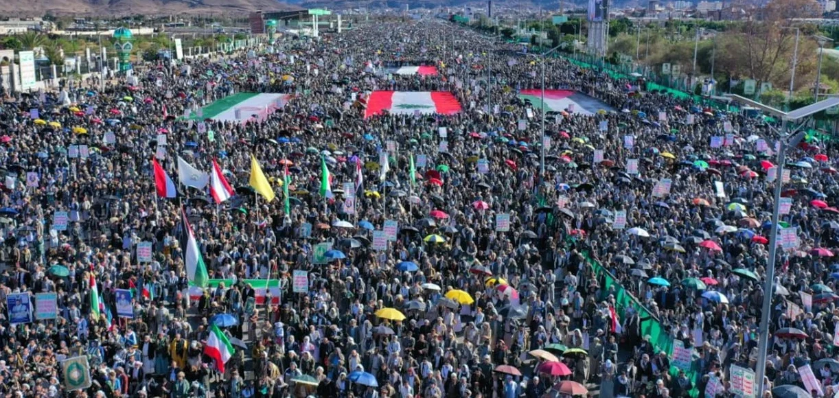 وامتلأ ميدان السبعين بالعاصمة صنعاء بسيل بشري كبير، توافد من مختلف المديريات، رافعًا أعلام اليمن وفلسطين ولبنان وإيران، ومرددًا شعارات تؤكد استمرار الصمود ورفض الخضوع لأي ضغوط، إلى جانب التأكيد على الموقف الثابت في مناصرة الشعب الفلسطيني والتصدي للسياسات الأمريكية والإسرائيلية في المنطقة.